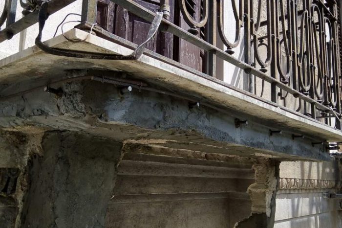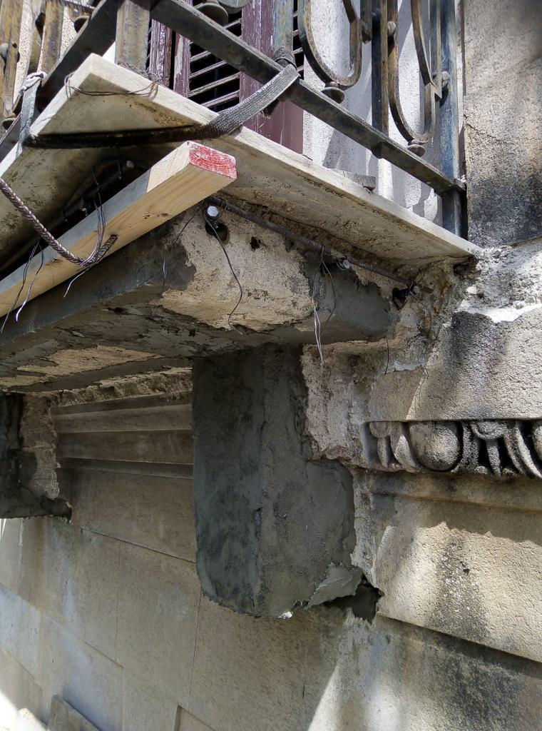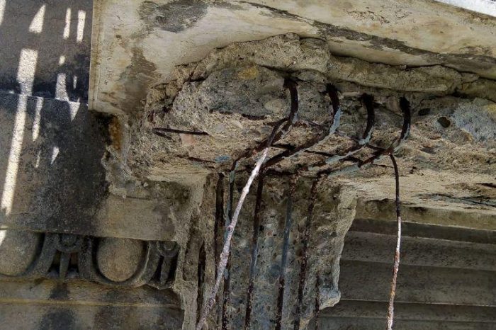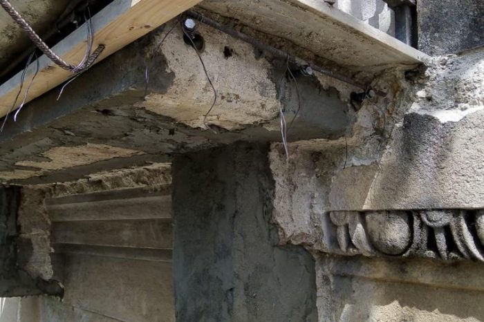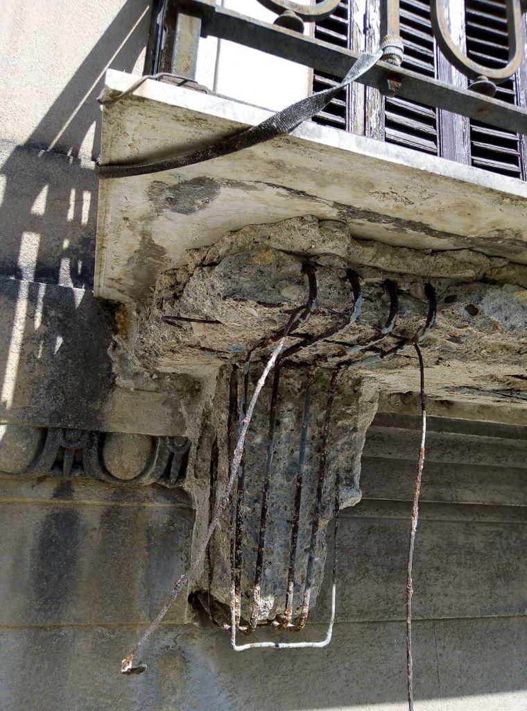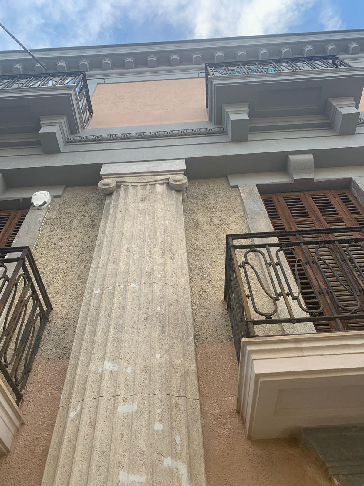 I prospetti presentano un aspetto di accentuato degrado, che si manifesta con una serie di patologie edilizie, in particolare in corrispondenza degli intonaci, degli elementi lapidei, dei laterizi, degli elementi in legno e fregi architettonici.