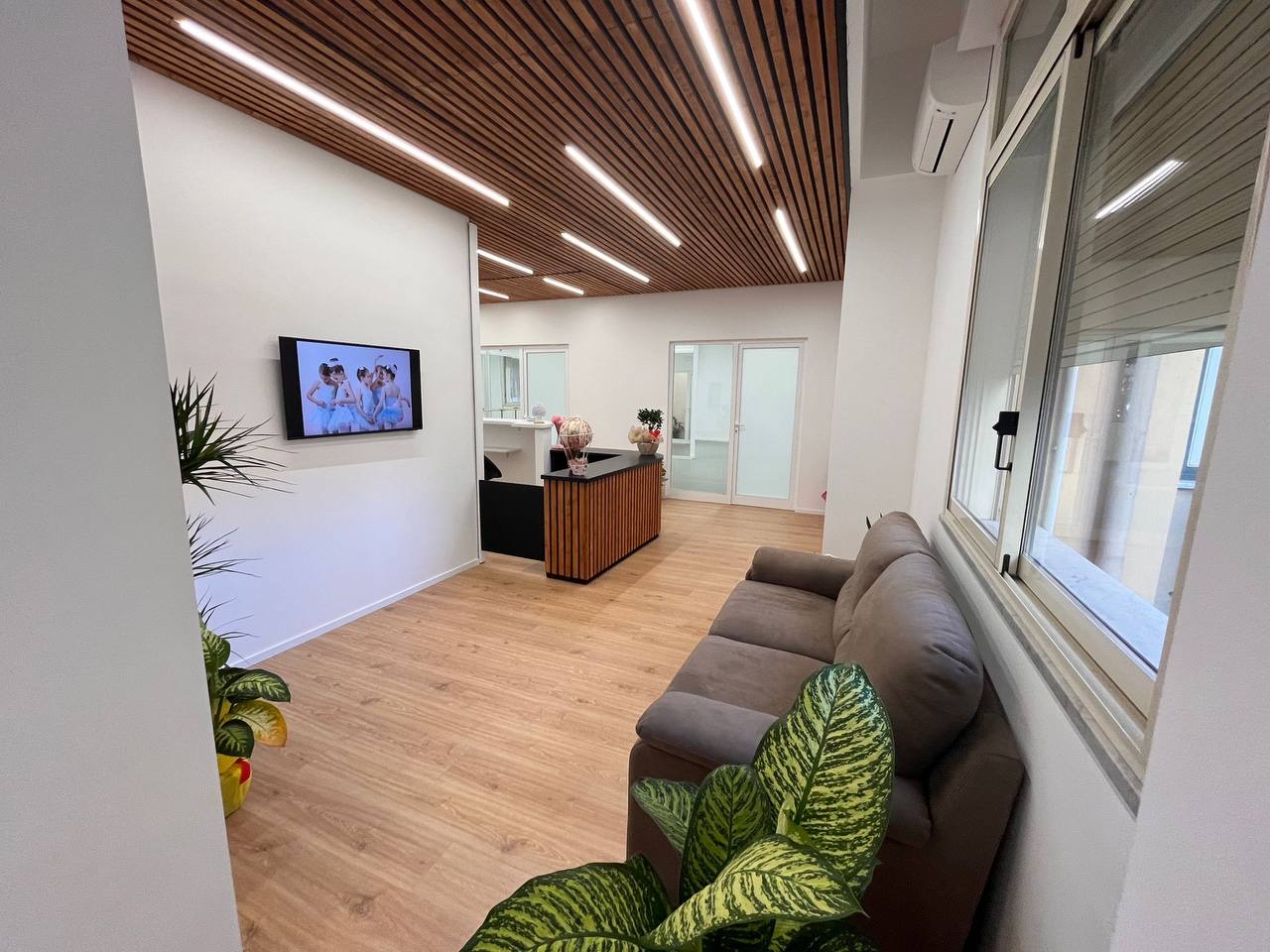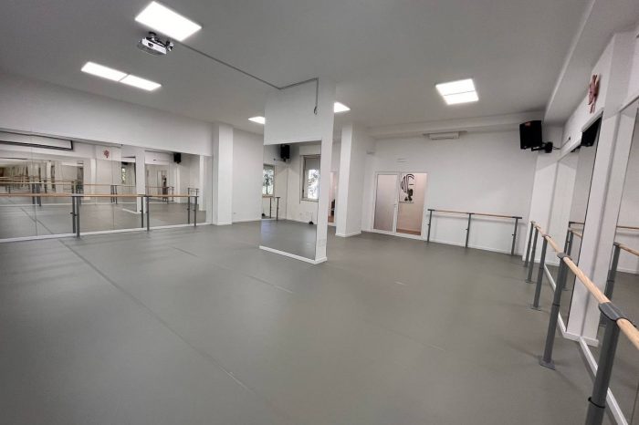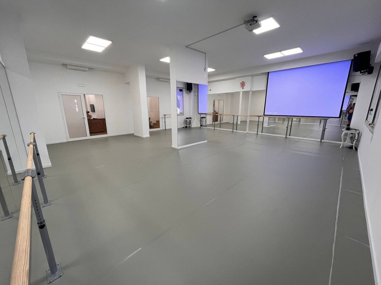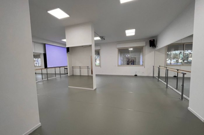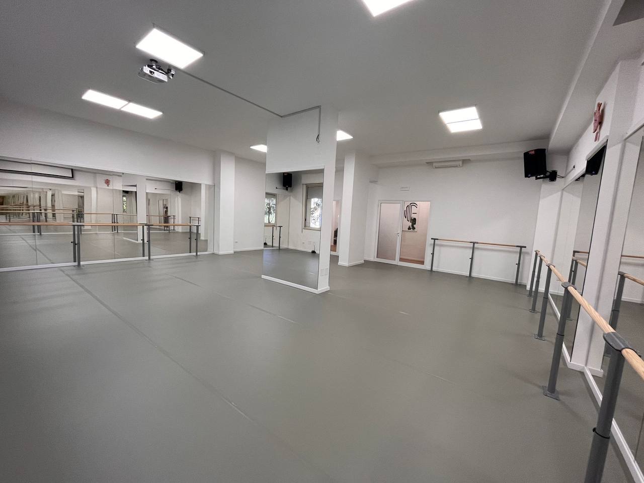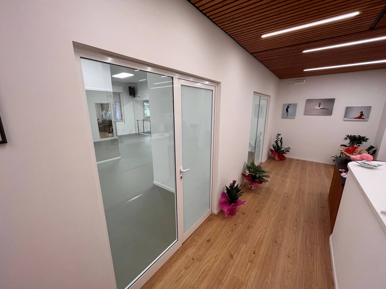 La hall di ingresso è caratterizzata da un soffitto con pannelli in legno e lame di luce incassate, che conducono a un’ampia sala di danza, quasi interamente vetrata, alla zona servizi e spogliatoi. I colori caldi del legno diventano elemento caratterizzante del progetto, riproposti nel bancone reception e nella pavimentazione in parquet. Il pavimento della sala di danza è rivestito da un tappetino in gomma integrato, materiale estremamente resistente e ideale per la danza. La cura nella scelta dei materiali e nella progettazione architettonica ha permesso di realizzare un ambiente confortevole e accogliente in cui svagarsi e allenarsi.