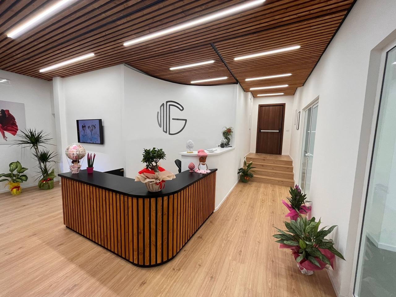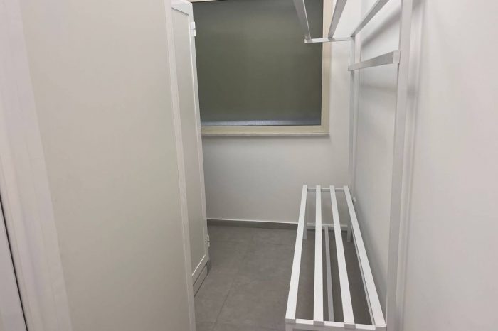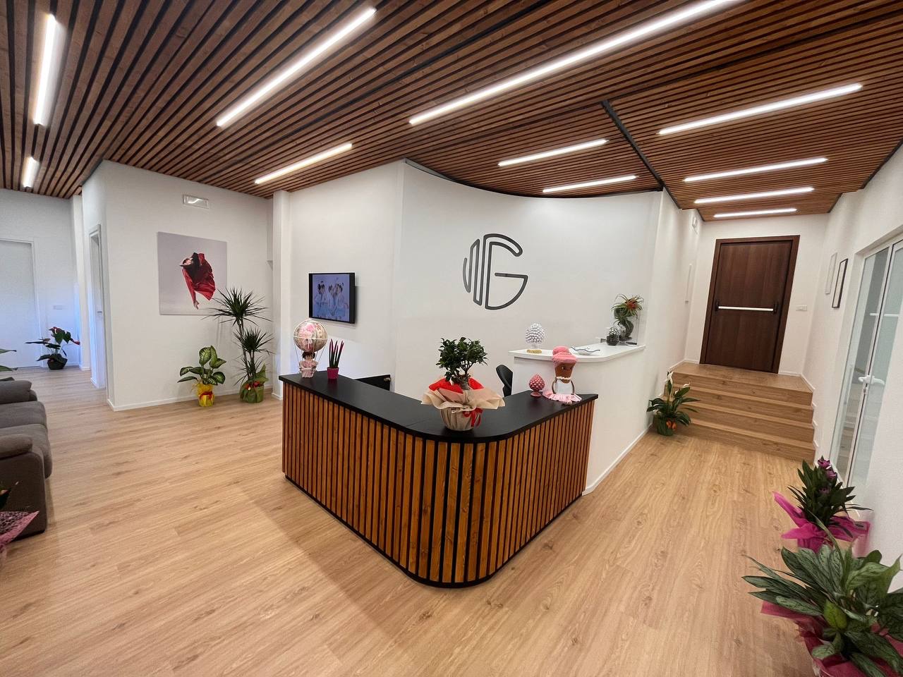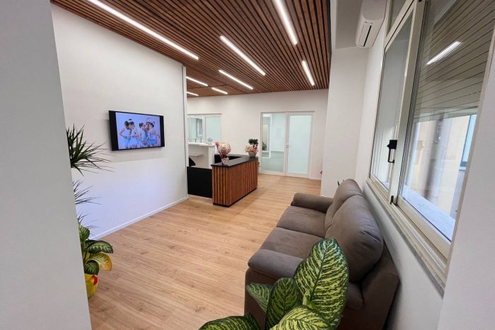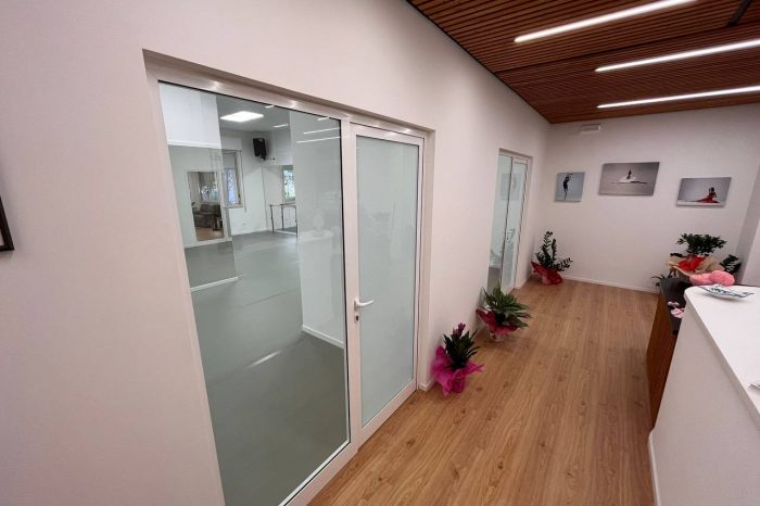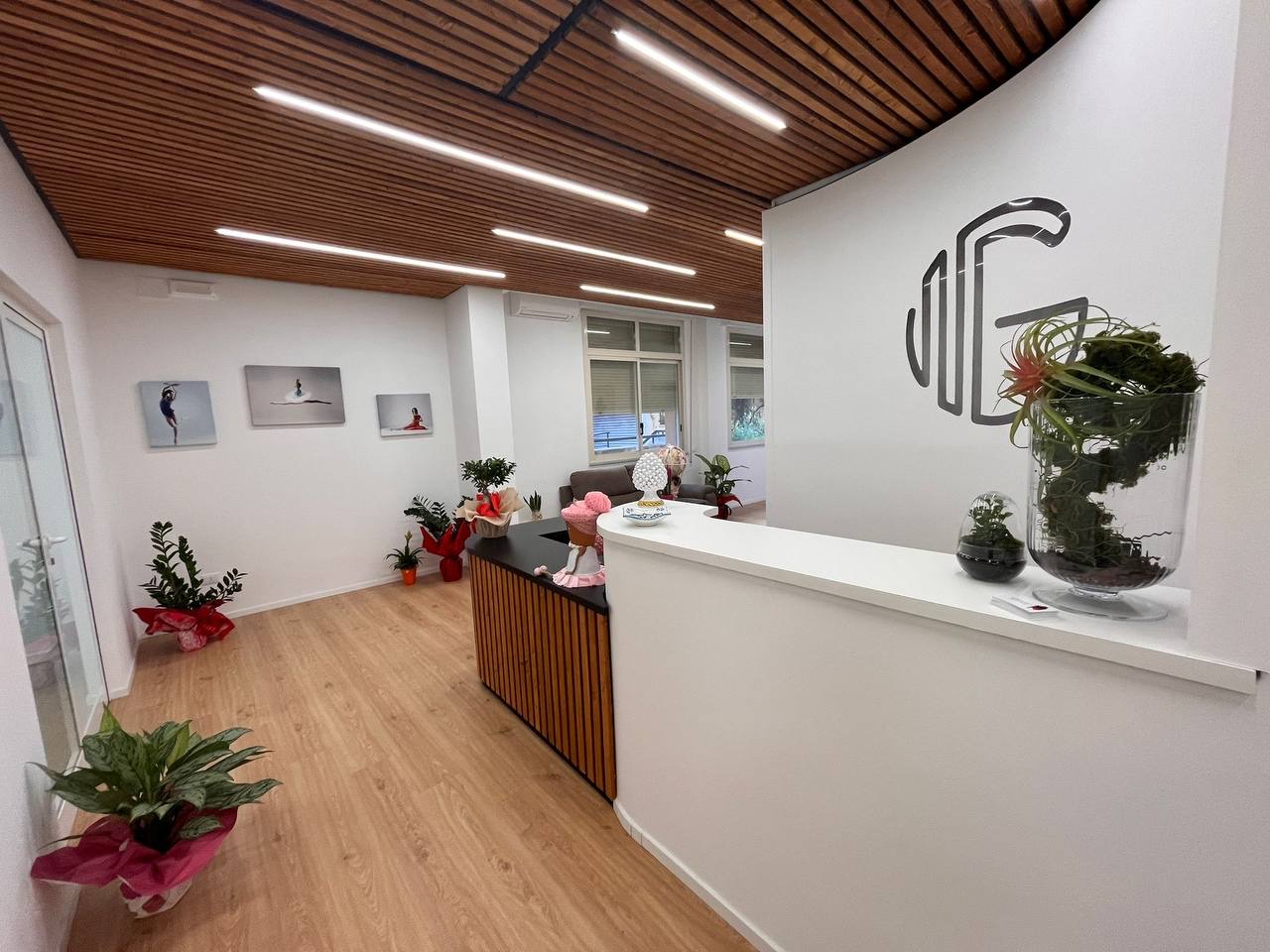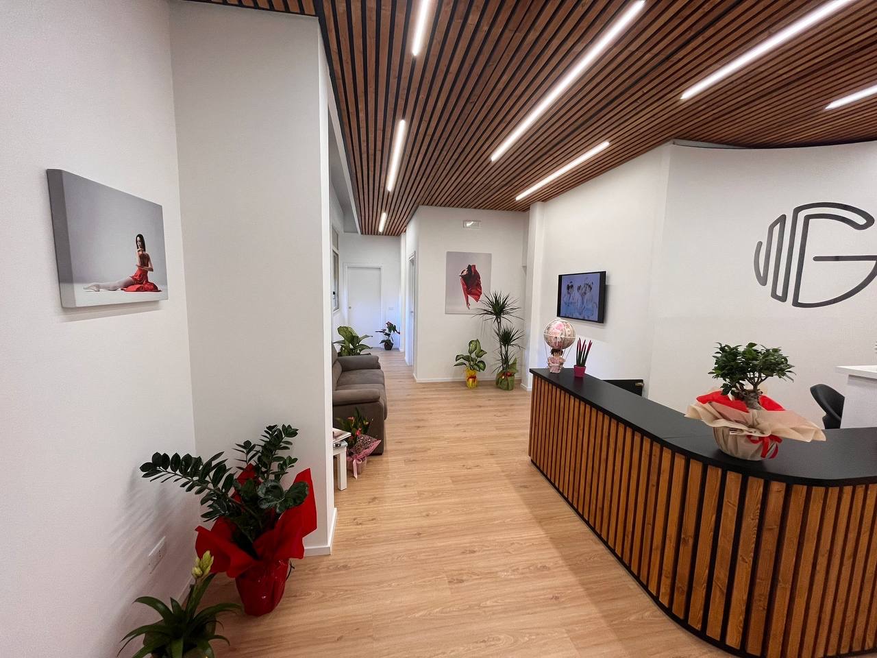 La hall di ingresso è caratterizzata da un soffitto con pannelli in legno e lame di luce incassate, che conducono a un’ampia sala di danza, quasi interamente vetrata, alla zona servizi e spogliatoi. I colori caldi del legno diventano elemento caratterizzante del progetto, riproposti nel bancone reception e nella pavimentazione in parquet. Il pavimento della sala di danza è rivestito da un tappetino in gomma integrato, materiale estremamente resistente e ideale per la danza. La cura nella scelta dei materiali e nella progettazione architettonica ha permesso di realizzare un ambiente confortevole e accogliente in cui svagarsi e allenarsi.