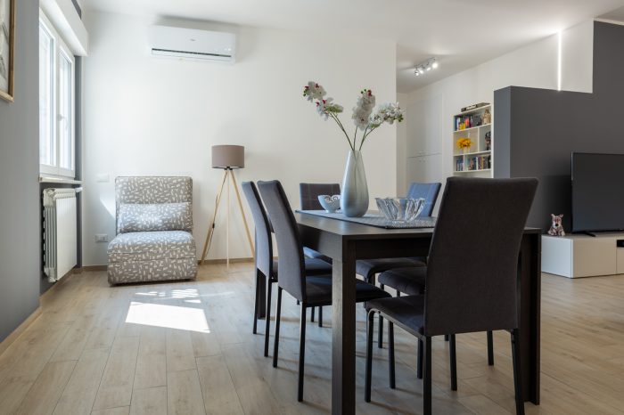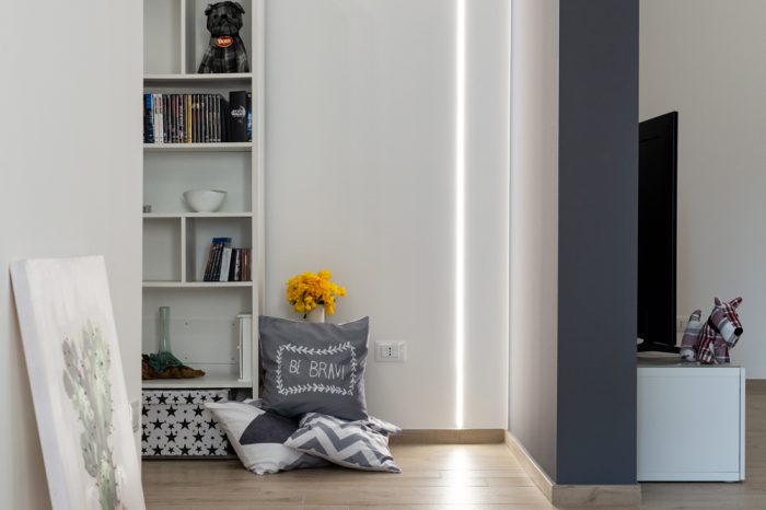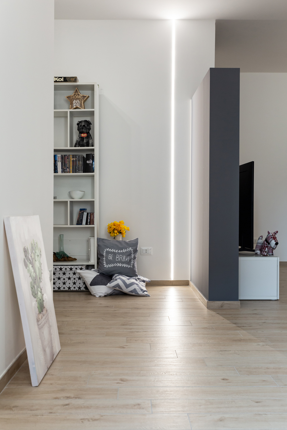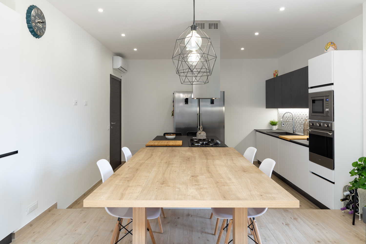 In questo progetto si è dato valore alla possibilità di creare ambienti ampi e confortevoli. La zona living gode di luci led che offrono la giusta atmosfera per ogni occasione. Un Disimpegno fa da filtro per la camera da letto matrimoniale con bagno in camera un ulteriore stanza da letto, bagno principale e cucina- sala da pranzo. Quest’ultima molto ampia, caratterizzata da un arredo moderno che coinvolge l’intero spazio donando funzionalità e confort, al cui centro si sviluppa un’isola con piano cottura e tavolo integrato. Attività di Progettazione e Direzione Lavori.